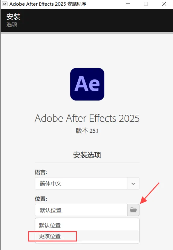 2.更改安装位置,建议更改到D盘或者E盘,记得新建一个【Ae2025】文件夹。(注意!安装路径文件夹不能出现中文)