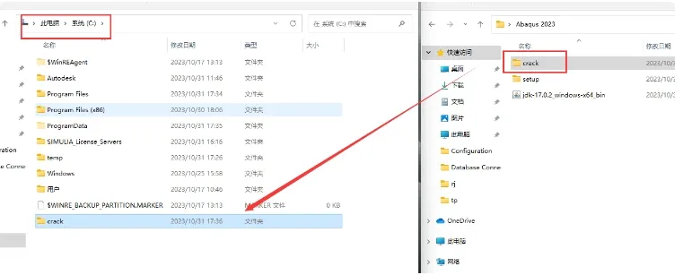 7. 将安装包中的crack文件夹复制到C盘根目录下。