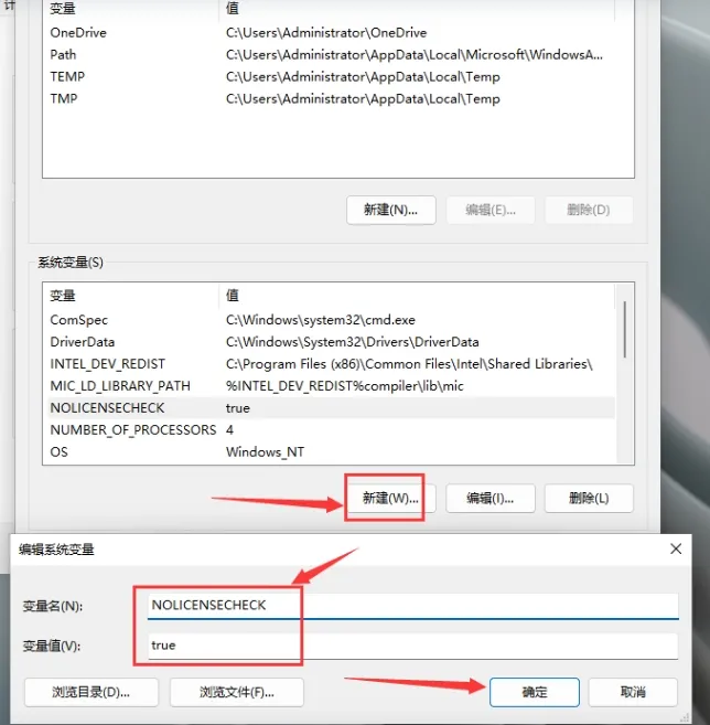 12. 新建系统变量,变量名填写:NOLICENSECHECK,变量值填写:true,点击“确定”保存。