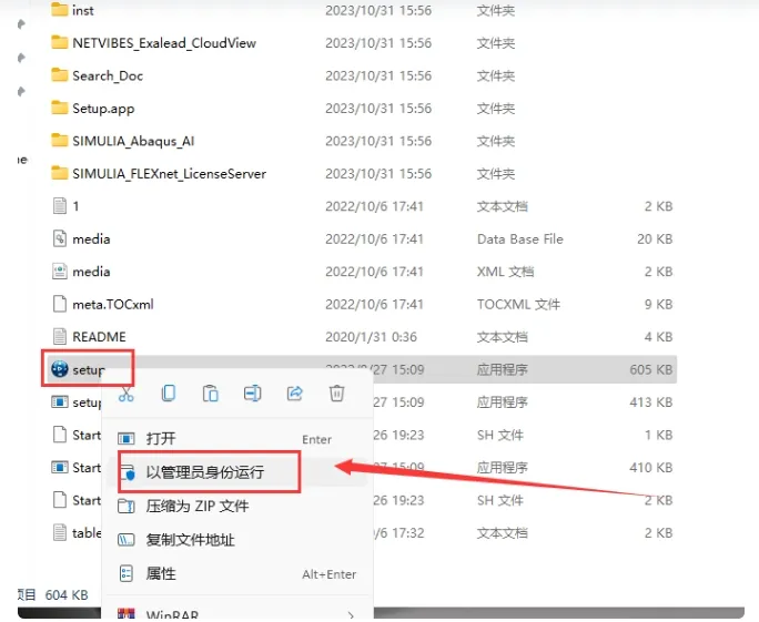 13. 返回安装包,进入setup-1文件夹,找到安装程序,右键点击并选择“以管理员身份运行”。