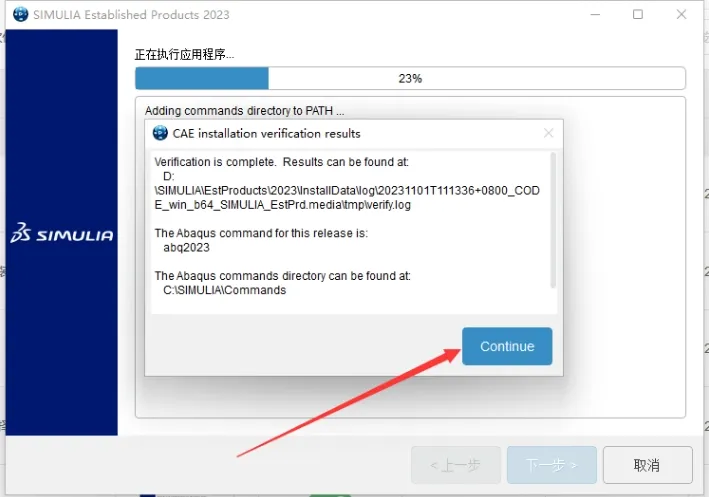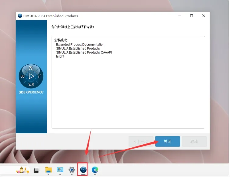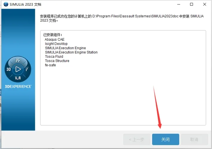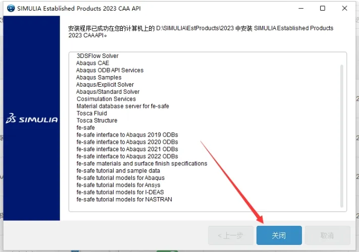 56. 安装成功后,路径显示为D:\SIMULIA\EstProducts\2023,点击“关闭”。