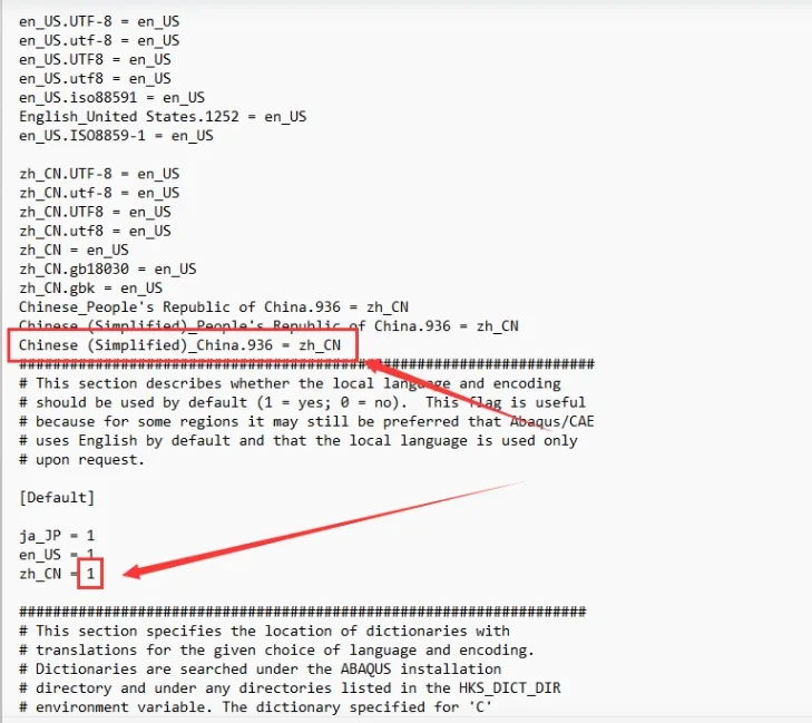 67. 在第45行后添加:Chinese (Simplified)_China.936=zh_CN,并将第58行的zh_CN=0改为zh_CN=1,保存文件。