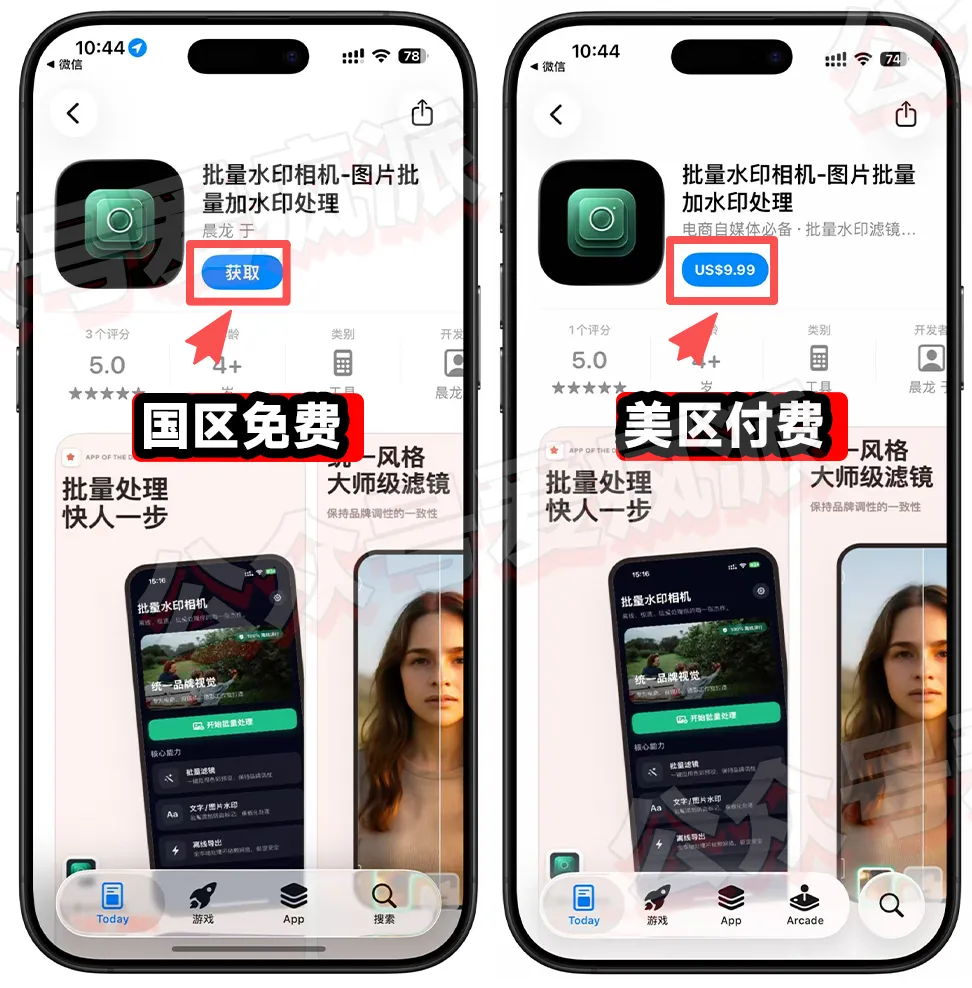 9.99 美刀!限时下载!速收大家好!分享一个苹果端不错的水印工具,支持文字 / 图片水印批量添加,还能一键滤镜美化,无损导出不压缩,目前国区 App Store 限时免费中,美区还是付费状态!软件支持一次性选择几十上百张图片,同时添加文字水印(品牌名、署名、版权信息)或图片水印(Logo、印章、二维码),彻底告别单张手动操作,效率提升数倍,再也不用为重复劳动浪费时间。