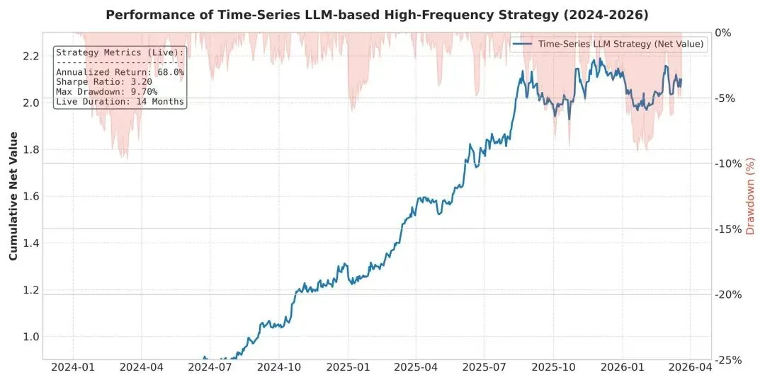 - 图:2024-2026年时序大模型策略实盘收益曲线,净值从1涨到2.1,最大回撤仅9.7