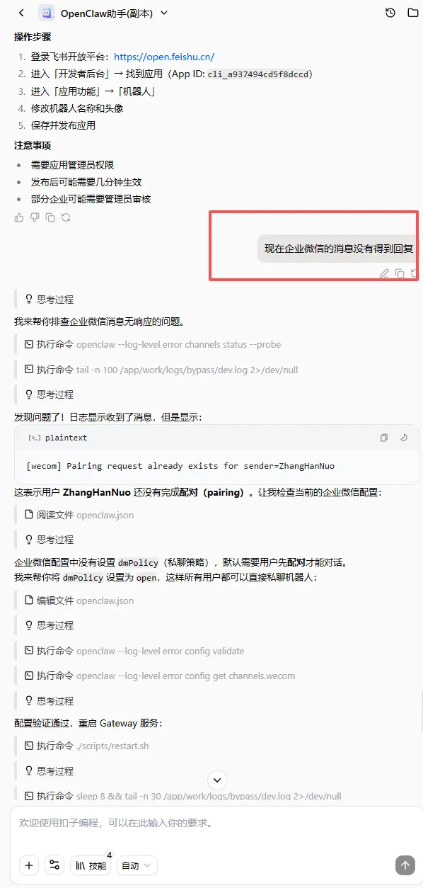 同时,扣子平台内置AI对话排错功能,部署过程中遇到任何问题,可直接通过AI咨询,快速获取针对性解决方案,无需自己翻教程、查资料,降低了排错门槛。