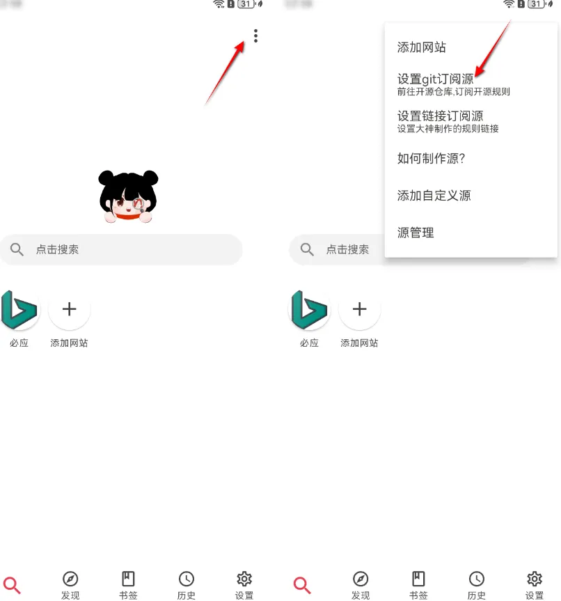添加步骤:点击左上角三个点,点击设置git订阅源,点击gitee搜索,点击其中一个源规则,点击订阅。