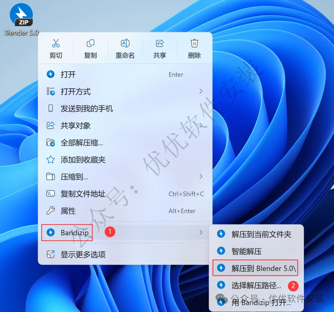 1、下载Blender 5.0软件安装包到电脑上,右键选择【解压到Blender 5.0\】