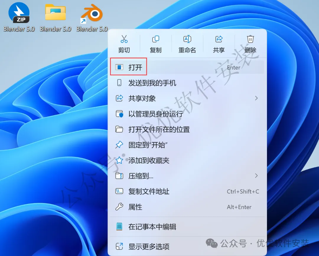 9、回到桌面,右键桌面上的【Blender 5.0软件图标】,点击【打开】