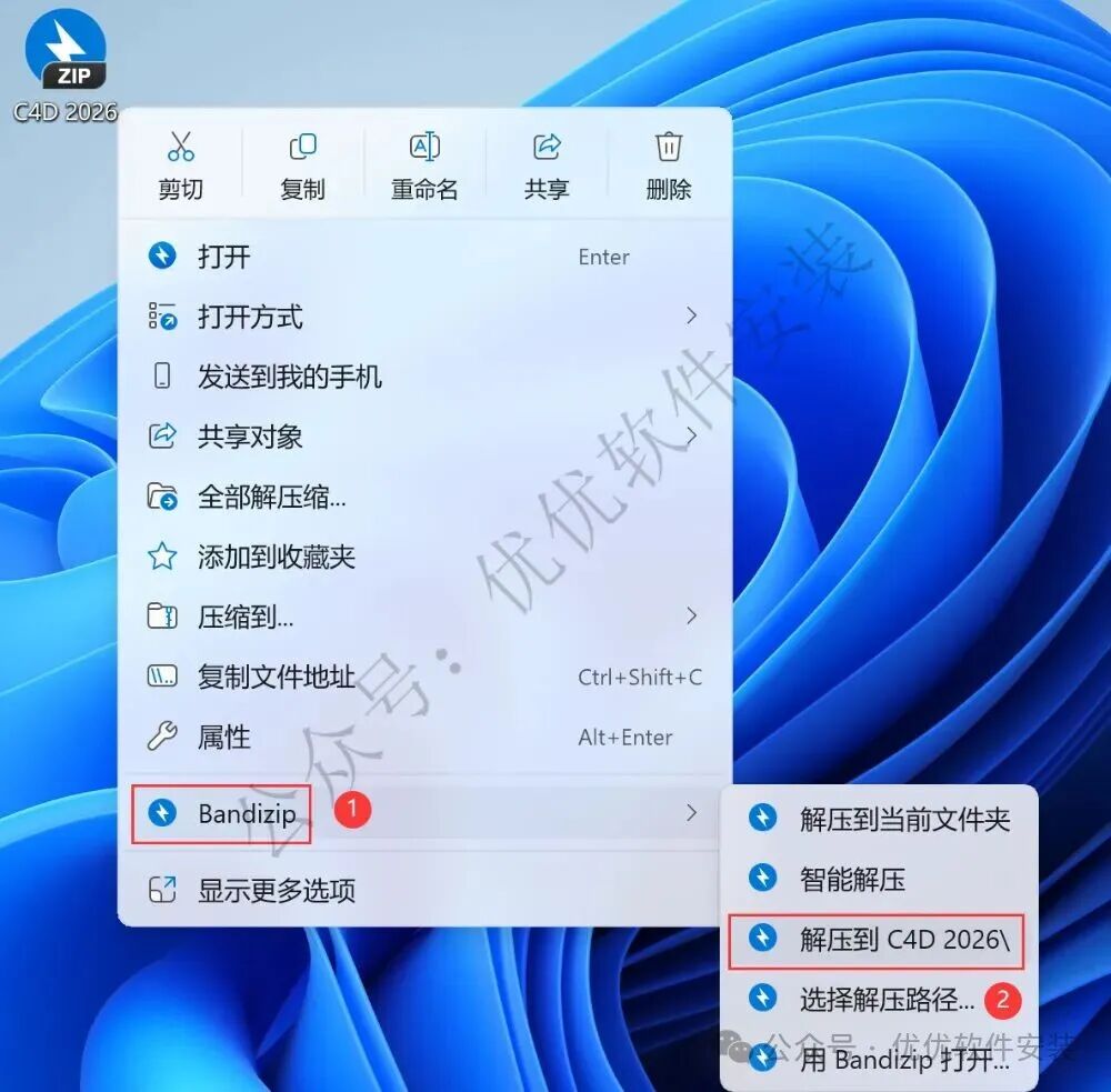 1、下载C4D 2026软件安装包到电脑上,右键选择【解压到C4D 2026\】