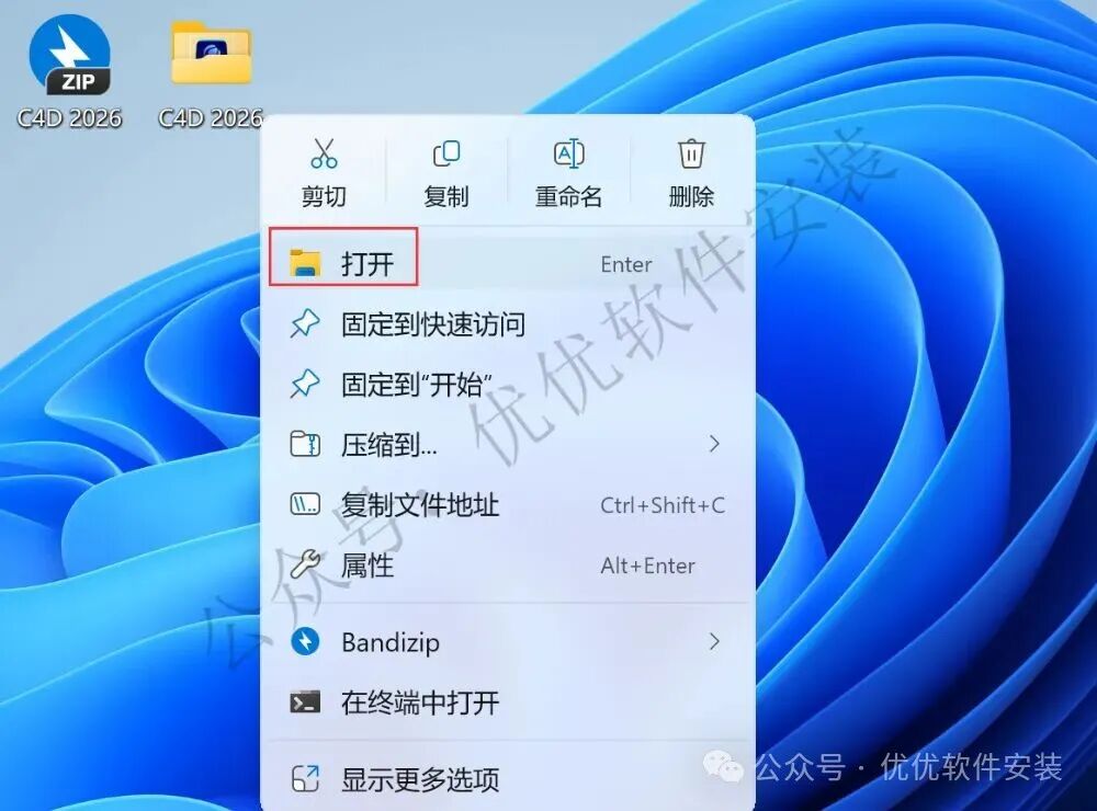 17、回到桌面,右键桌面上的【C4D 2026软件图标】,点击【打开】