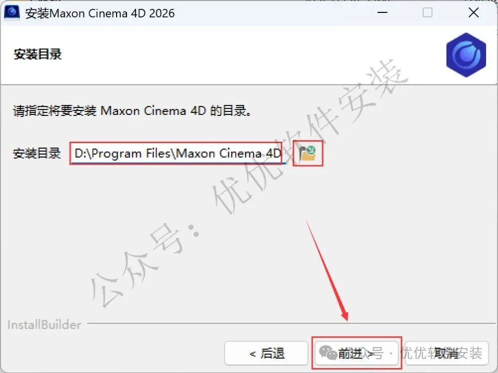 5、软件默认安装在C盘,可自定义更改软件安装位置,这里小编选择安装在D盘;点击【前进】