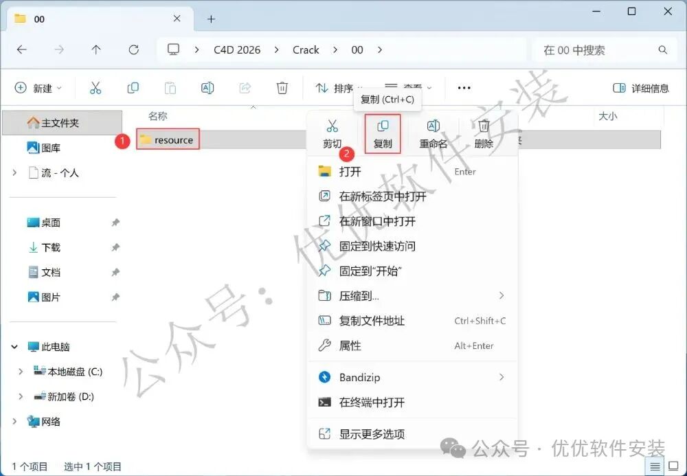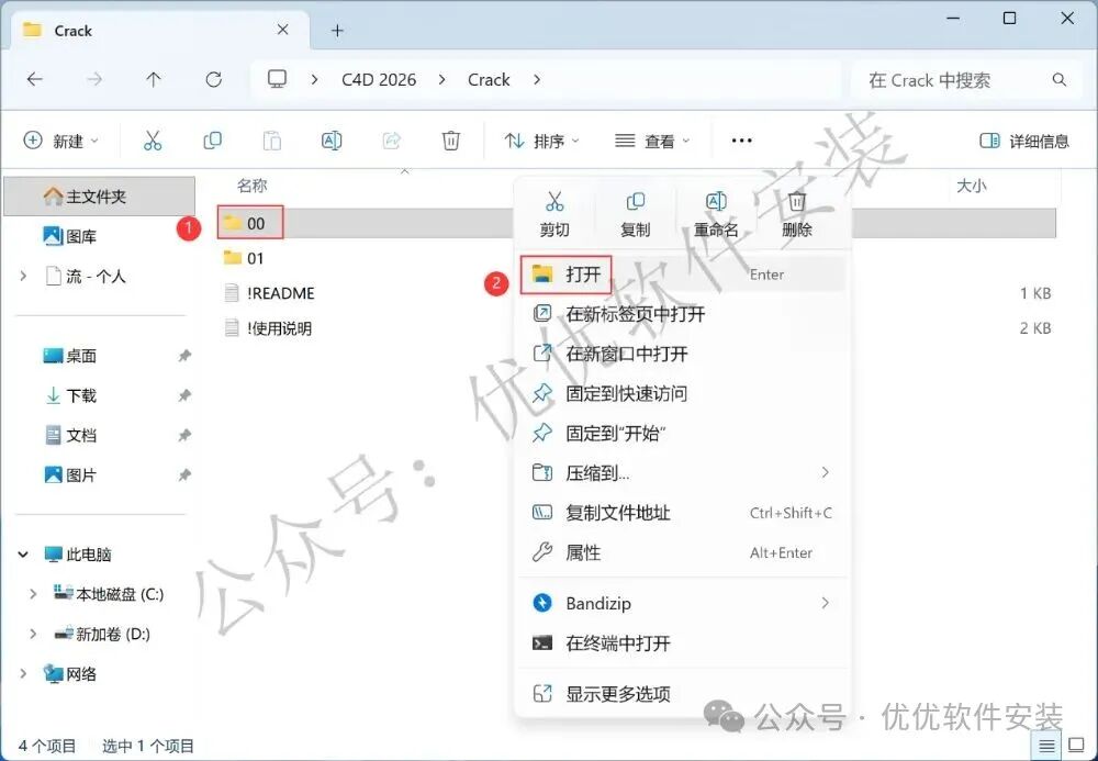 11、回到C4D 2026文件夹,找到【Crack】文件夹,右键【打开】它