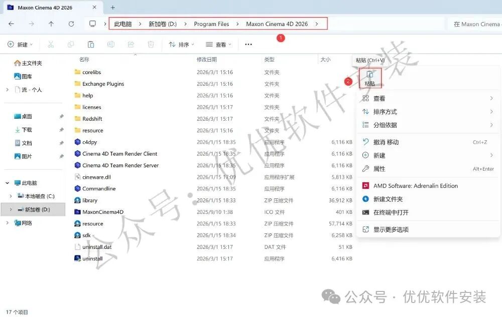 14、打开路径:D:\Program Files\ Maxon Cinema 4D 2026,再右键文件夹的空白处,点击【粘贴按钮】