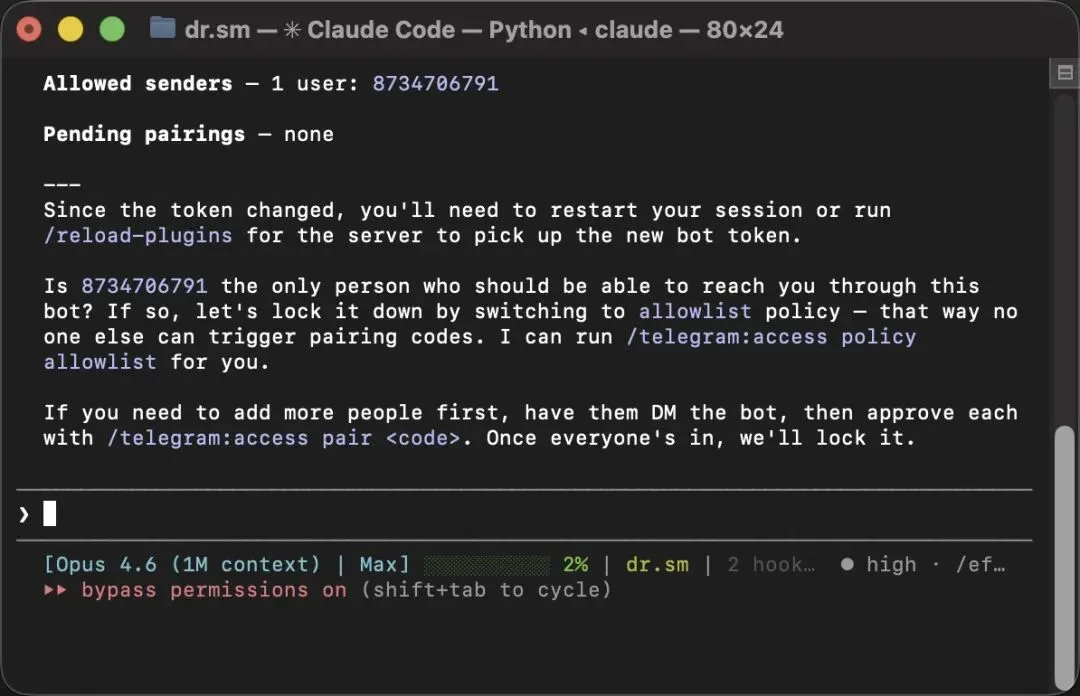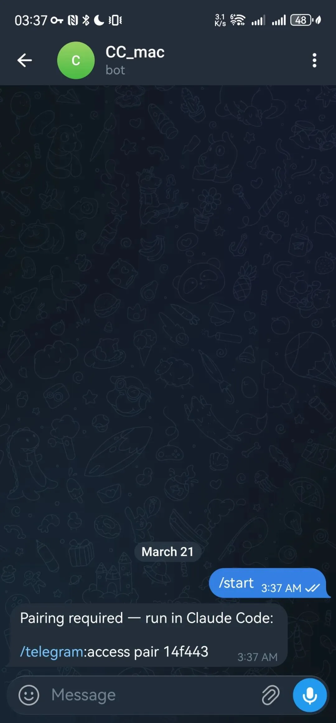 手机上打开你的 Bot,发送 /start,收到 6 位配对码: