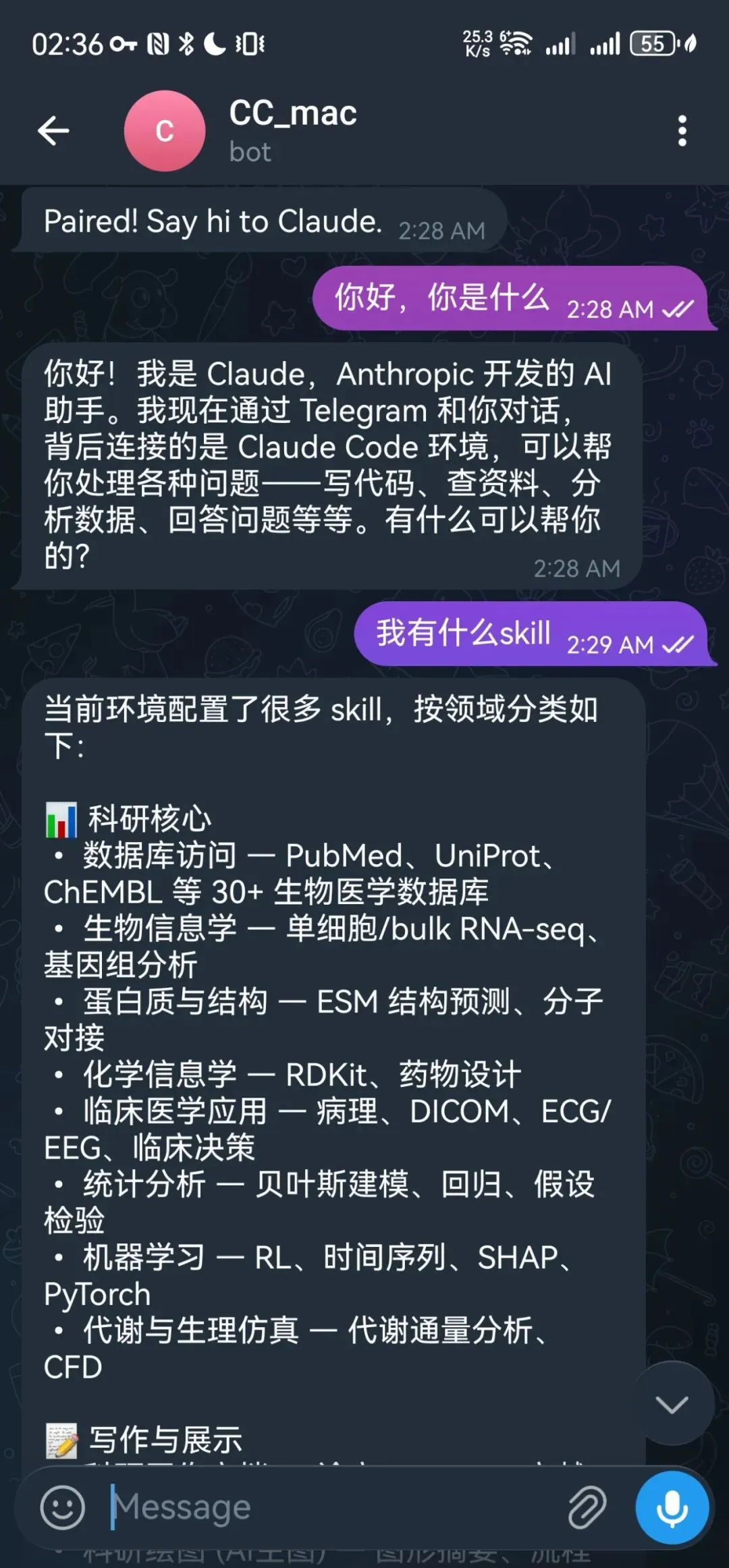 • 临床门诊:正在看病人,给 Bot 发"用 skill 查询 CYP2D6 和氟西汀的相互作用",几秒后结果到手机 • 科室晨会:主任问最新进展,给 Bot 发"进入pubmed检索近3个月 OCTA 在糖网中的应用",一分钟后文献列表就到了 • 术前准备:给 Bot 发"读取桌面上的手术流程文档,列出关键步骤和注意事项",Claude Code 帮你秒速回顾 • 论文修改:审稿意见刚回来,地铁上就能让 Claude Code 开始改稿,到实验室活儿已经干完了 • 数据分析:食堂吃饭时发一句"用 scanpy skill 分析这个 h5ad 文件,做聚类生成 UMAP",回到工位图已经躺在文件夹里