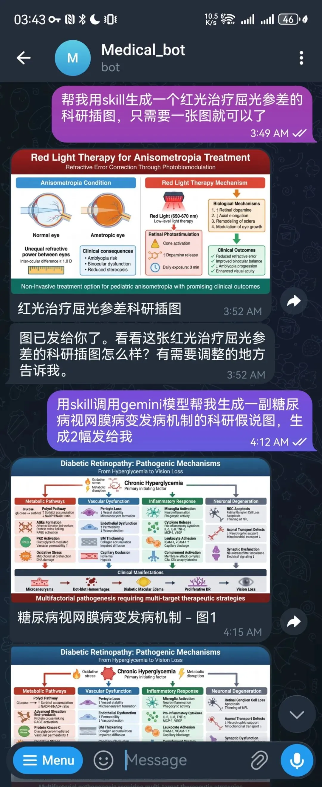 1、科研插图生成:让它调用 Skill 生成红光治疗屈光参差的科研示意图,以及糖尿病视网膜病变发病机制图,直接以图片形式发回手机: