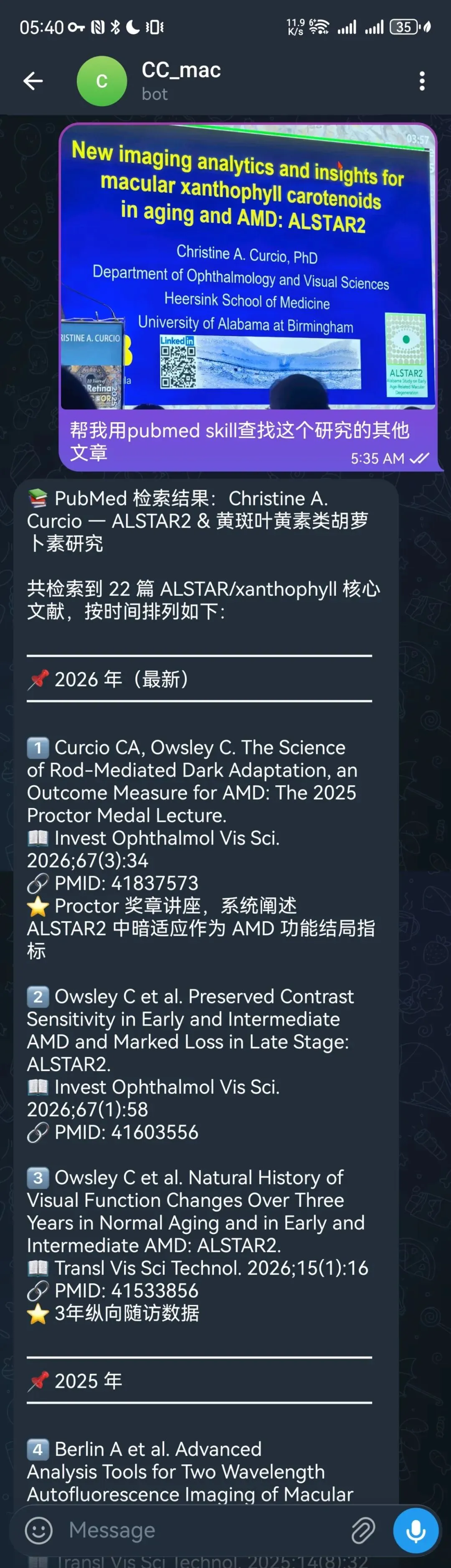 2、听课即查文献:参加学术讲座时,讲者提到一项研究,想了解更多?直接把拍的幻灯片照片发给 Bot,让 Claude Code 调用 PubMed Skill 检索该作者的相关文献——22 篇核心文献按年份整理,每篇附 PMID,边听课边掌握完整脉络: