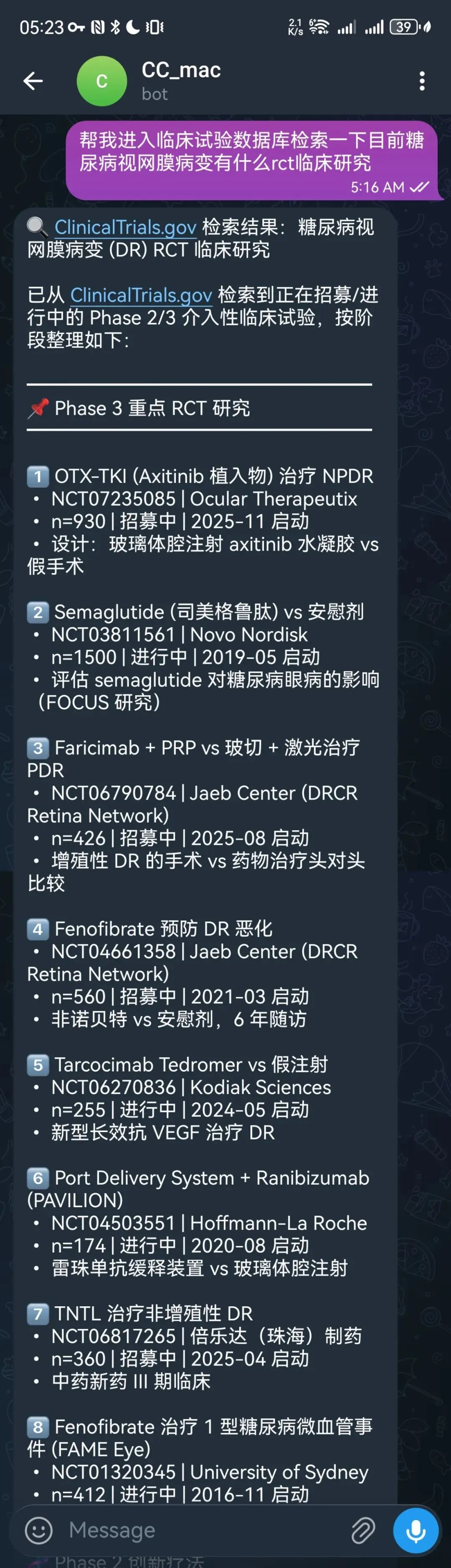 3、RCT研究注册检索:让它检索糖尿病视网膜病变的 RCT 临床研究有哪些正在进行,从 ClinicalTrials.gov 数据库拉取结果,按治疗类别整理好发给你(接入数据库,返回的一定是真实结果):
