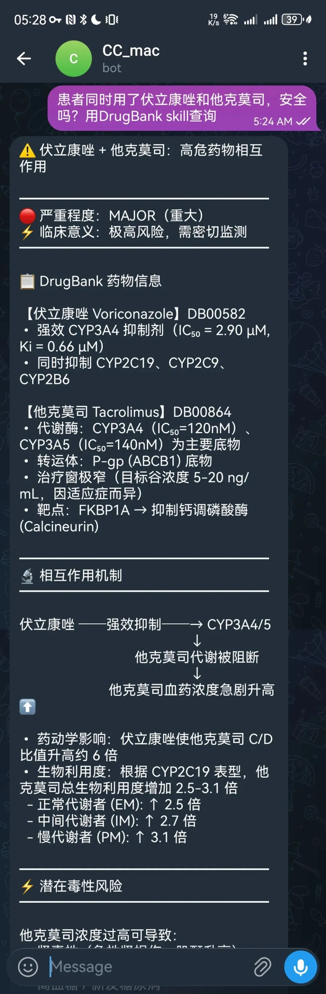 4、药物相互作用查询:患者同时用了伏立康唑和他克莫司,安全吗?给 Bot 发一句话,Claude Code 调用 DrugBank Skill 返回完整的药物相互作用报告——严重程度、CYP 代谢机制、血药浓度变化倍数,直接可以用于临床决策:
