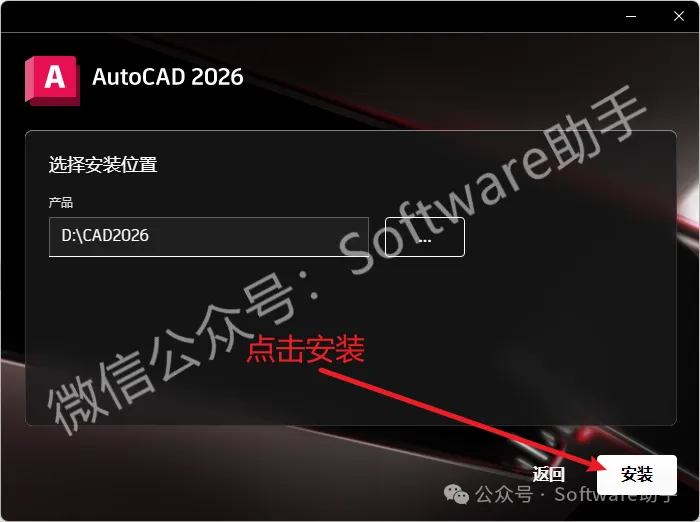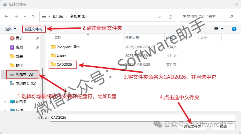 6.先选择你想要将软件安装的盘符,比如D盘。再点击【新建文件夹】,将文件夹命名为:CAD2026,并且选中它,最后点击【选择文件夹】。