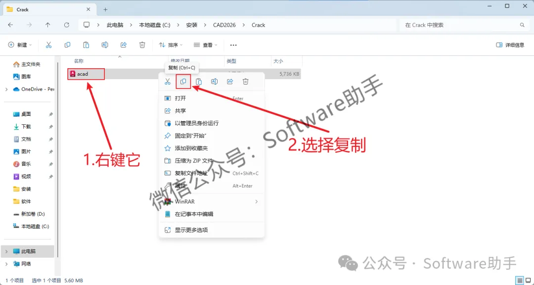 11.鼠标右键【acad】,选择复制,或者使用快捷键【Ctrl】+【C】来复制它