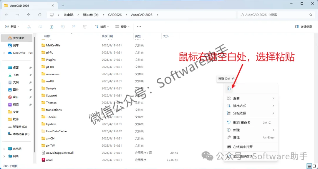13.先将文件夹放大,然后鼠标右键空白处,选择粘贴,或者使用快捷键【Ctrl】+【V】来粘贴