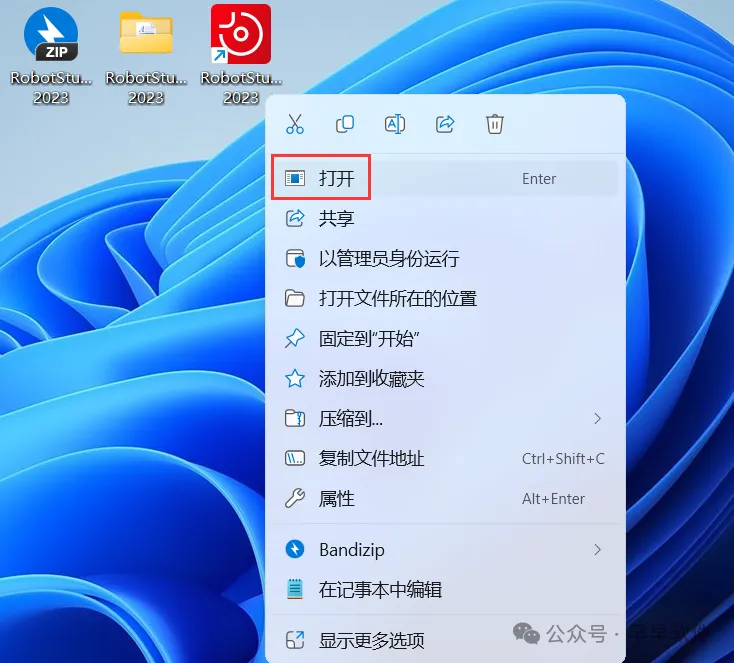 14、回到桌面,右键桌面上的【RobotStudio 2023软件图标】,点击【打开】