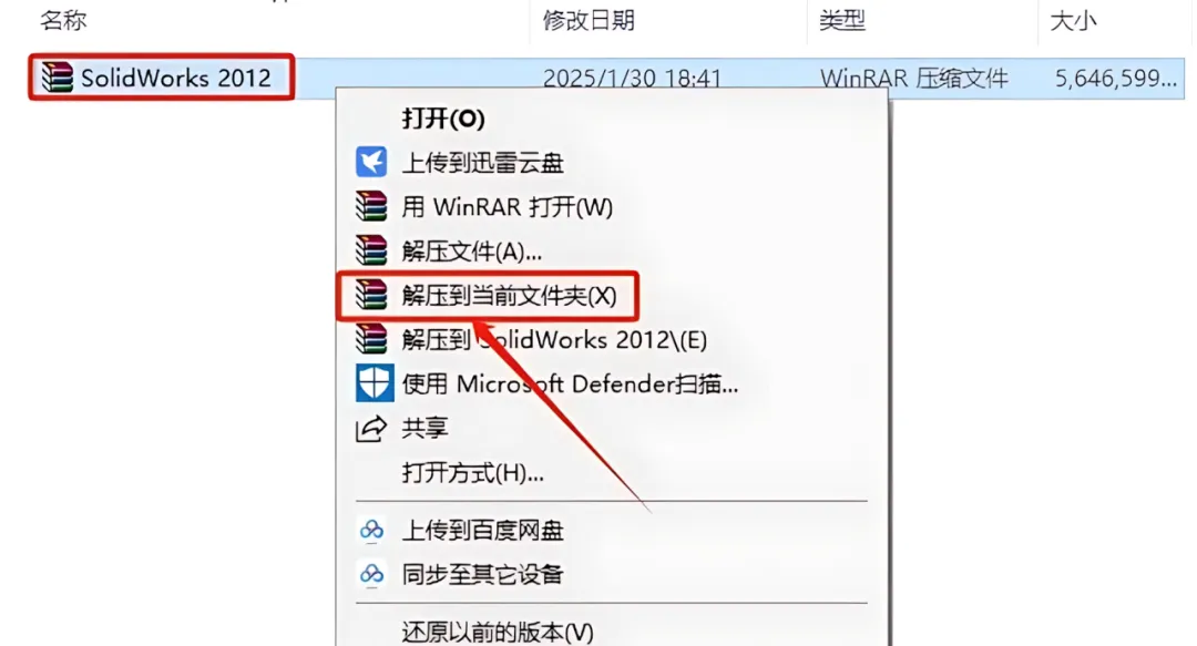 1.打开下载的SolidWorks软件安装包,鼠标右击压缩包选择【解压到当前文件夹】。