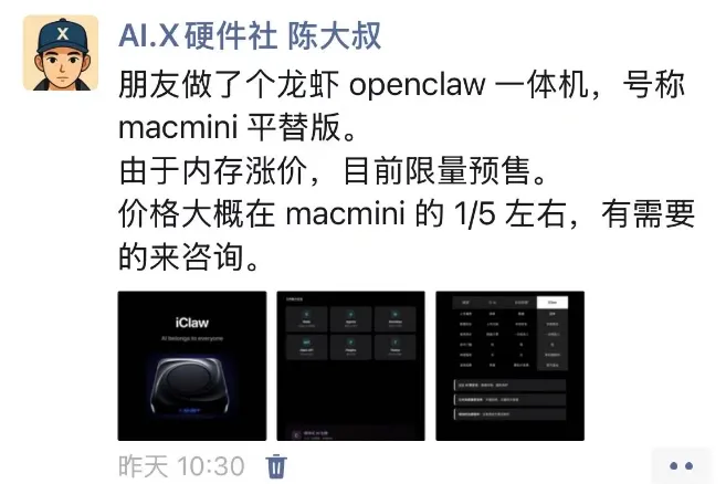 OpenClaw最早和硬件出圈是Mac mini 卖断货,一台原本无人问津的苹果小主机,现在处于一个全国断货、二手涨价、租赁火到爆的状态。