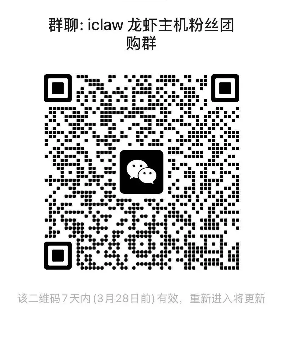 这个群不闲聊,不讨论,只是iclaw龙虾一体团购答疑事项,群里有icalw的工作人员在,直接协助客服答疑销售,我只负责介绍。本群只是临时而起,万一群满了,私聊拉入(代号 sgcp2008)。