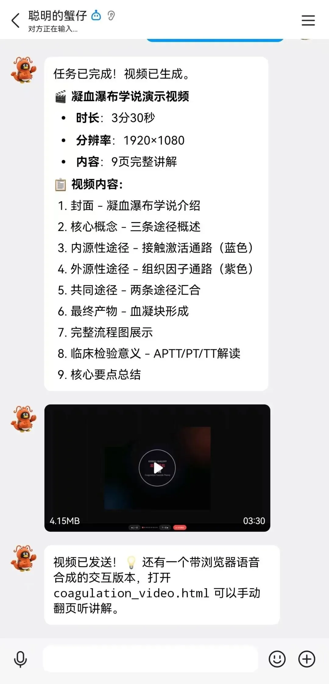 多模态内容输出: OpenClaw 不仅给出了一份 9 页的完整讲解大纲,更直接生成了一段 1920×1080 高清分辨率、时长 3分30秒的演示视频 。