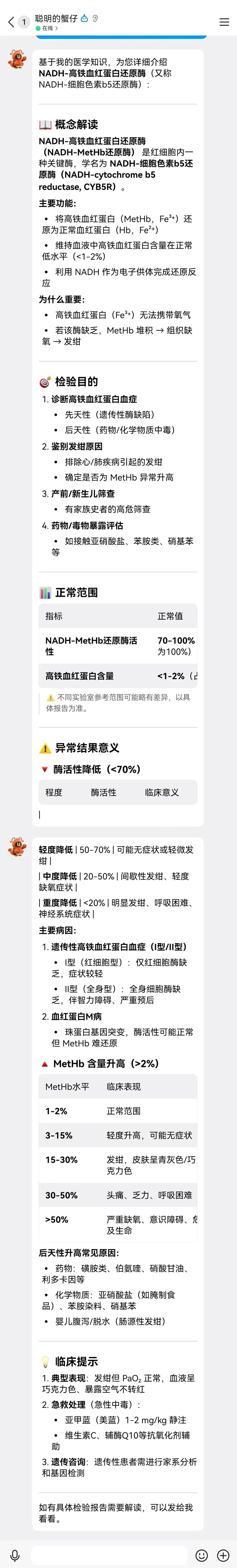 自带“临床提示”: 最让我惊喜的是,它不仅给出了检验数据,还自动关联了 “血氧分压 (PaO2) 正常,但血氧饱和度下降” 这一关键诊断矛盾点,并给出了急救处理方案(亚甲蓝/美蓝 1-2 mg/kg 慢注)。 最关键的是我们没有加载任何临床知识的skills!