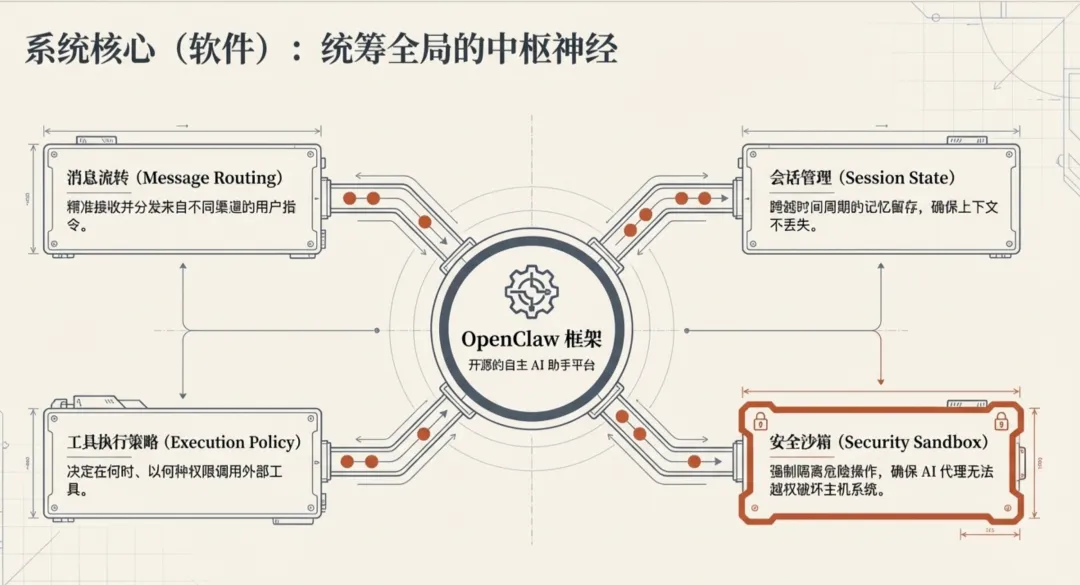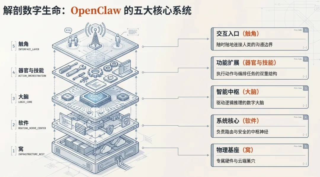 OpenClaw龙虾组件解析,一文说清楚,专治迷糊导语“ 大部分人因为没有系统的知识框架,因此在做判断的时候都是跟着感觉在走,情绪主导了一切 ,这与事实和真相无关。一如《乌合之众》里面描述的,群体是无意识的,所以领袖主导了一切 ”百虾大战激战正酣,不同厂商各自推出了自己的“龙虾变种产品”,搞的人眼花瞭望,在加上自媒体朋友们的推波助澜,一时难以区分和甄别,我今天来写一个基本概念梳理贴,从普通用户的视角来看看一只“龙虾”的组成部分一、一只龙虾🦞的五个必要组成部分(普通用户视角)市面上让你眼花缭乱的各种🦞,万变不离其宗,核心部分只有5个,抓住核心即可,它们分别是:-龙虾软件本身源头都在openclaw上,版本的迭代和更新也是依赖它的进度,目前版本是3.13- 🦞的家(窝)软件是要装在你的“电脑上”,这个可以是你的笔记本电脑、也可以是一个盒子(比如man mini) ,当然也可以在云上购买云服务器(租用云服务器),这个取决每个人的喜好- 🦞的大脑🧠现在AI化改造的软件产品,基座大模型(LLM)是发动机一样的存在,必不可少,市面上你听过的各种模型厂商提供的都可以,个人观点是,LLM一定要选好的,最优秀的,不能将就,道理显而易见,发动机不行,车在好也跑不快,不要为剩那个几个小钱,选择讲究款来用,不值当,更何况各个厂家都有coding plan的套餐- Skills技能及平台技能这玩意,可以热插拔,无限扩展,100%支持自定义,当然 openClaw考虑到了它的重要性,单独搞了clawhub项目来沉淀开源的Skills,个人认为这是最重要的部分,当然这得感谢Anthropic把它开源了,无论代码编程还是🦞平台,这都是非常伟大的发明;当然,国内也有了,某大厂出品的也不错,国内的不限速- 撩🦞入口(im通道)龙虾之父Peter最开始开发的时候,对通道channel就是开放支持的,所以这也是所有IM公司必须下场争夺智能体入口的必然原因,入口之战,还能带动云和大模型,国内疯狂成如此火🔥的程度,吃瓜群众也就了然于胸了。不过,我需要强调的是一个基本概念,那就是所有的龙虾和IM通道配置过程中,都需要在各自的开放平台上注册机器人(bot) ,然后把你的appid ,appsecret告诉你的龙虾并且要配对成功才能在im中使用,这里我罗列了平台地址国外的我后面会单独写一个出来,后面再说最后,补充一个功能模块之间的业务流程图㊗️大家养🦞快乐,有问题,+v找我