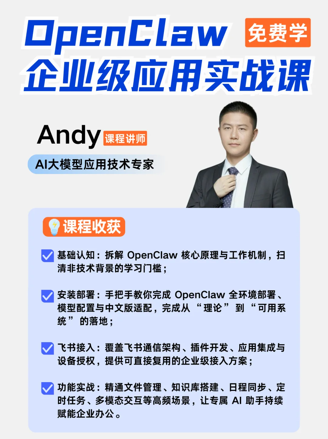 OpenClaw 企业级部署与私有化配置 飞书集成、插件开发、全链路接入方案 文件管理、知识库、日程同步、定时任务 财务、办公、数据处理等真实场景实战