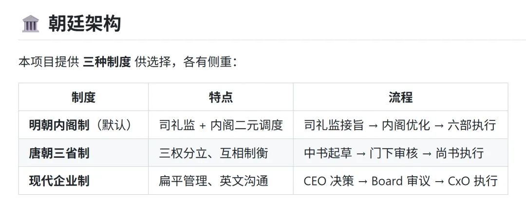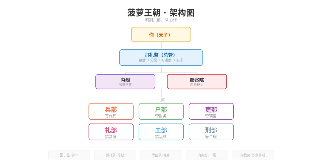 菠萝王朝架构非常清晰:司礼监负责接你的“圣旨”(Prompt),内阁负责优化并拆解任务,六部负责执行具体工作,最后由都察院自动审查代码和产出质量。