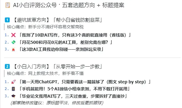 先说选题。它给了5个方向:避坑拔草、小白入门、场景解决方案、横向对比、羊毛福利。每个方向3个具体标题,一共15个标题。