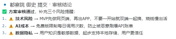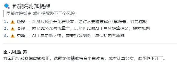 都察院最后出场,给了三个风险提醒,每一条都是那种自己做的时候很容易忽略、但又容易踩坑的实战经验。