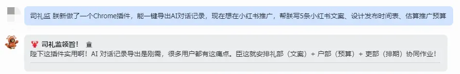 先来热热身,让它们给朕做个公众号,选题需要礼部,成本测算需要户部,内容审核需要都察院。