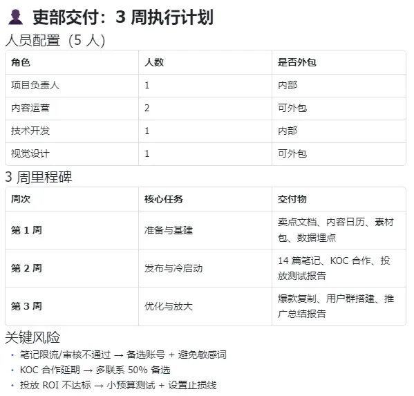 还列了风险预案,比如笔记限流怎么办、KOC合作延期怎么办、投放ROI不达标怎么办。