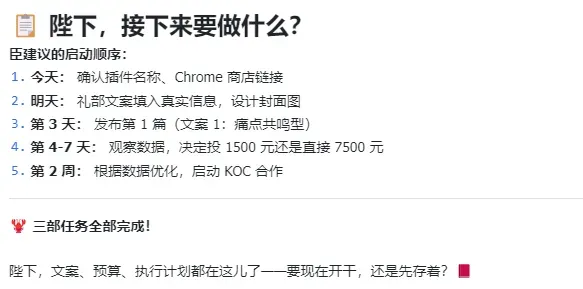 最后司礼监把三个部门的交付物汇总成一份完整报告发给我这个赛博皇帝,末尾还给了一个启动建议:今天确认插件名称和商店链接,明天填入真实信息设计封面图,第3天就可以发第一篇了。