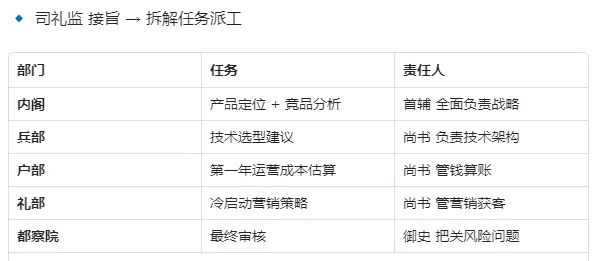 内阁拿到旨意之后,先做了一轮任务拆解和优先级排序,然后同时派给了多个部门:内阁自己负责产品定位和竞品分析,兵部负责技术选型,户部算钱,礼部做营销策略。