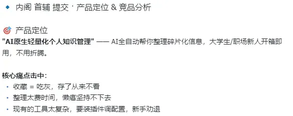 内阁第一个出手。产品定位一句话就说清楚了,AI原生轻量化个人知识管理,开箱即用不用折腾。痛点分析也很准,收藏等于吃灰、整理太费时间、现有工具太复杂劝退新手。