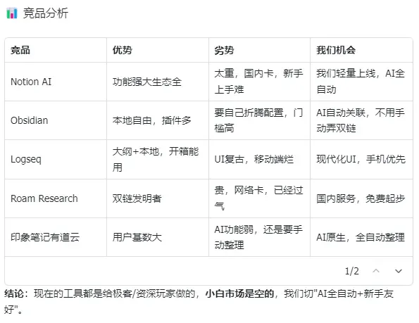 竞品分析表现也不错。它不是简单列了个表就完事,而是对每个竞品都分析了优势、劣势以及我们如果要创业的话所拥有的机会,