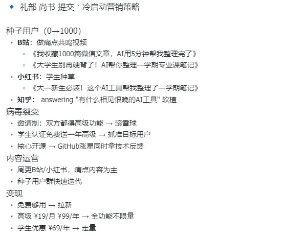 它没有给我那种大而空的全渠道营销方案,而是非常针对性地给了三个渠道的具体打法:B站做痛点共鸣视频、小红书做学生种草、知乎去有什么相见恨晚的AI工具这类问题下面软植入。