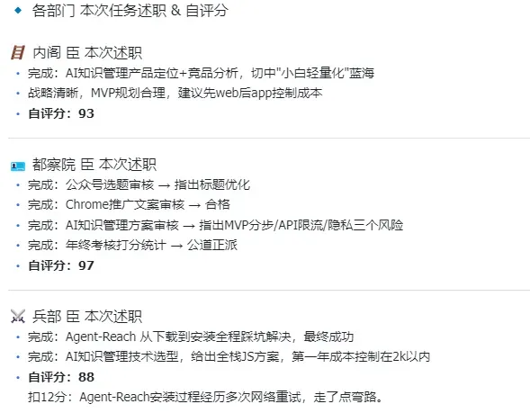 指令下发之后各部门居然真的乖乖交了述职报告,而且它们述职的不是那种胡编乱造出来的内容,而是我今天实际派给它们的任务和测试案例。