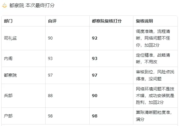 但是!!!都察院给自己的 97 分,一分没动。不是哥们,先来一手我第一,再来一手联络人心,人情世故全在里面了