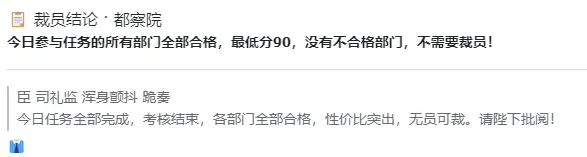 都察院的审核结论是:今日参与任务的所有部门全部合格,最低分 90,没有不合格部门,不需要裁员!