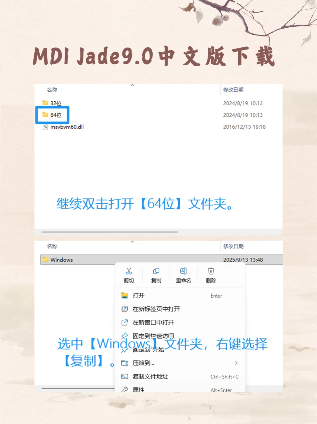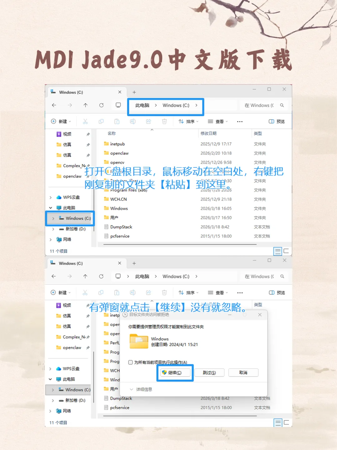 1. 系统级覆盖:进入Crack->64位(或32位),复制Windows文件夹,直接粘贴至C 盘根目录。若提示覆盖,请点击继续。