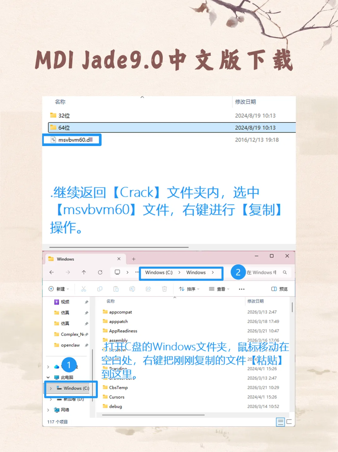 2. 补齐 VB 运行库:在Crack目录复制msvbvm60文件,将其粘贴至C:\Windows文件夹内。