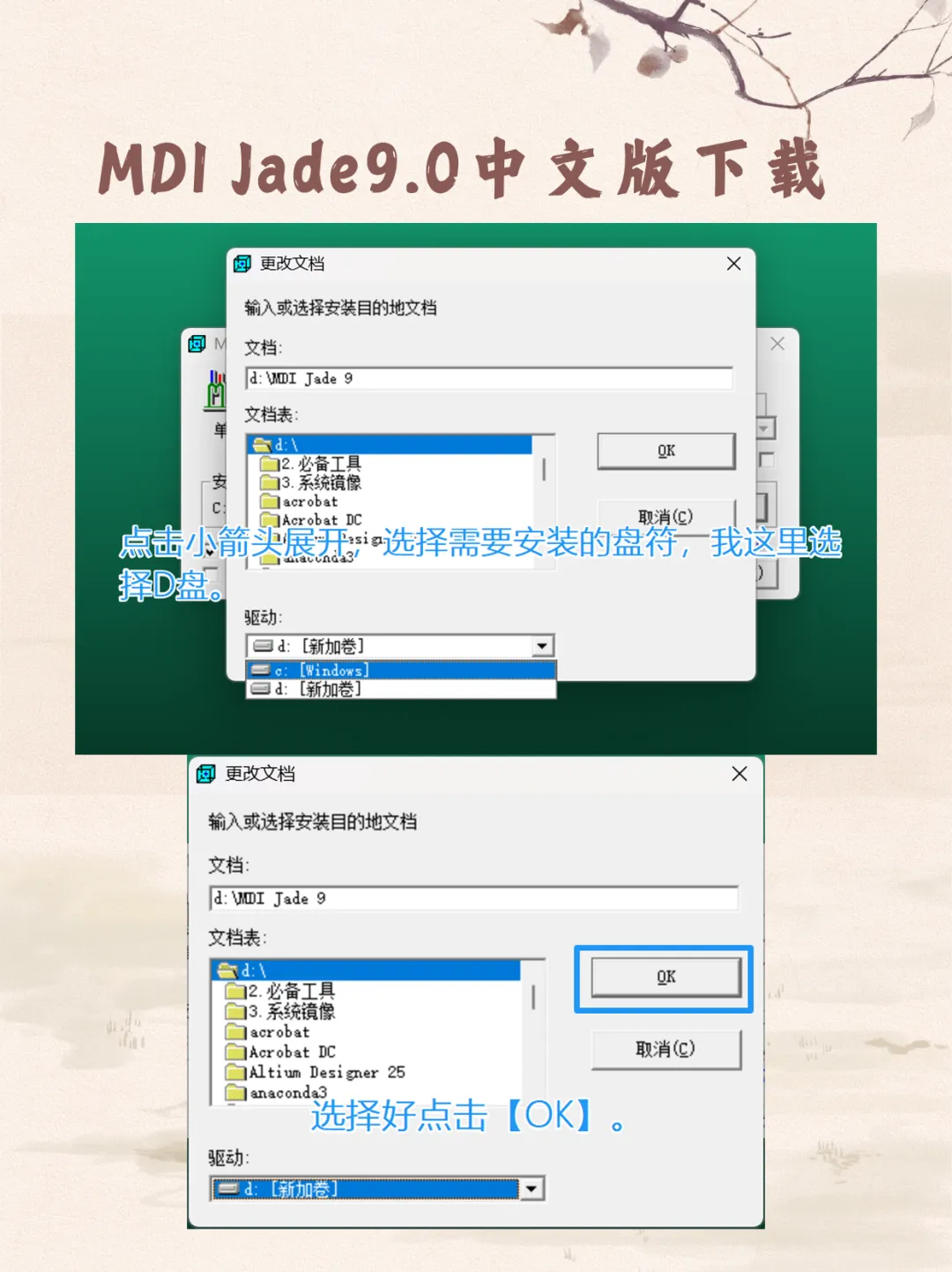 2. 路径自定义:点击“更改安装文档”,建议将 C 盘符改为D盘或其他非系统盘。